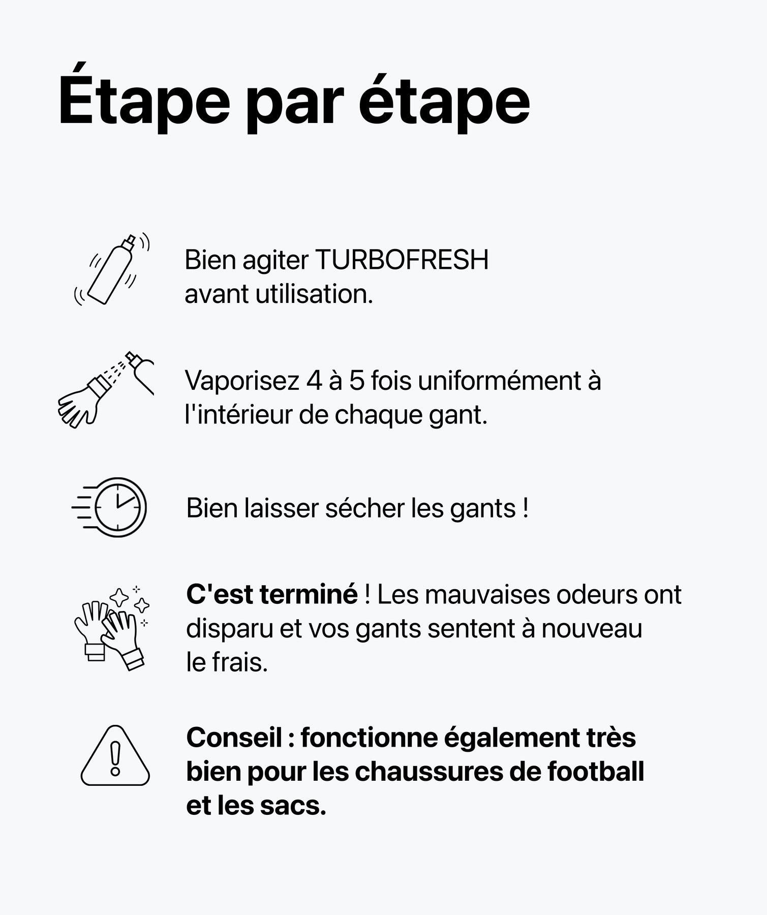 Après chaque activité sportive, nettoie d’abord les gants avec TURBOCLEAN, puis agite bien TURBOFRESH. Pulvérise 4 à 5 fois uniformément à l’intérieur de chaque gant, laisse bien sécher – c’est tout ! Les mauvaises odeurs disparaissent et tes gloves sentent à nouveau le frais.