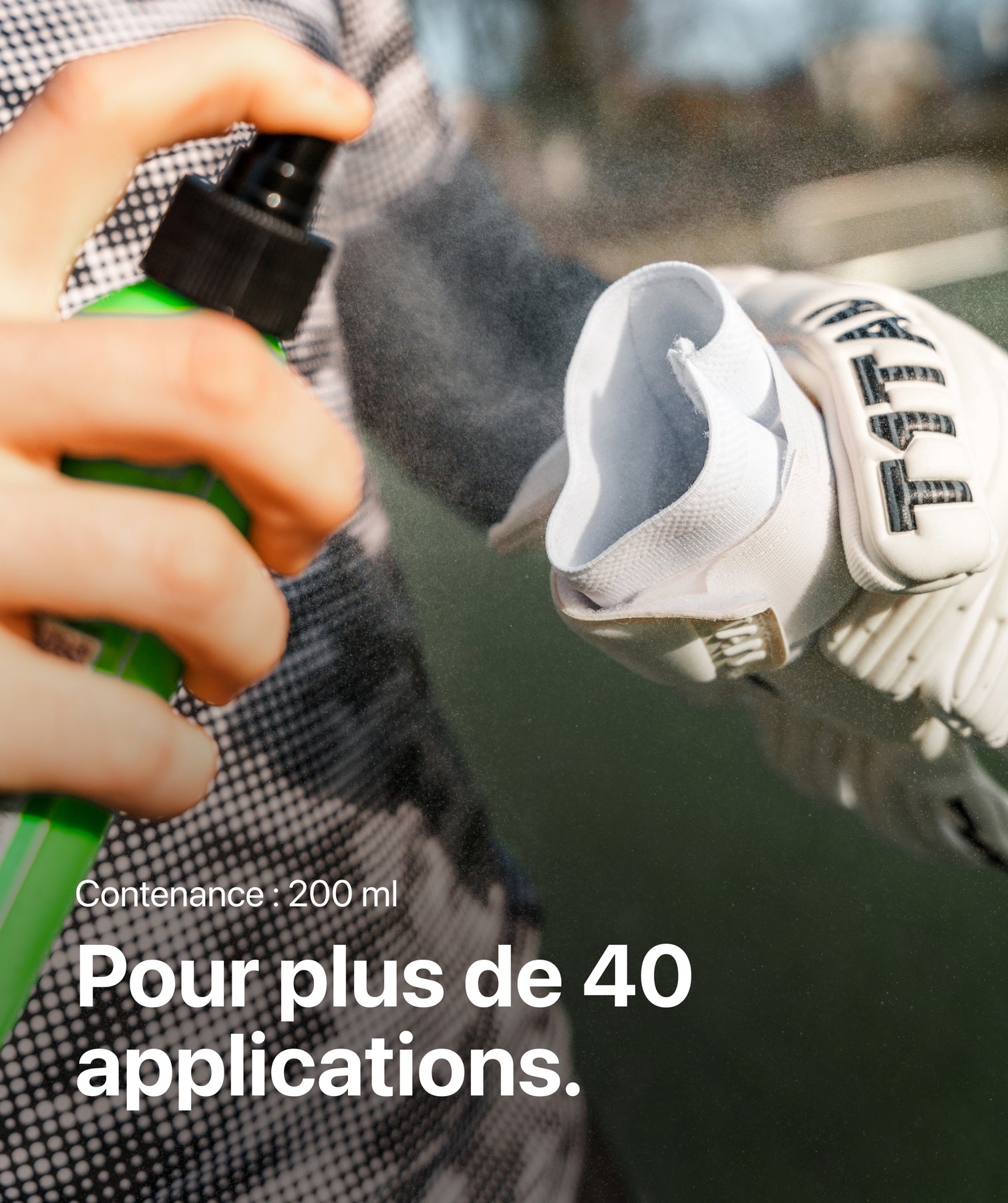 Le spray a été spécialement conçu pour les gants de gardien de but, mais peut également être utilisé pour d'autres articles de sport tels que les chaussures, les protège-tibias ou les sacs.